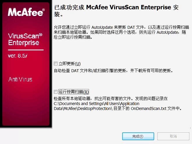 此mcafee8.5I全集成版.安装包共59.5MB,总共安装完毕不过2分钟多.无须断线安装.