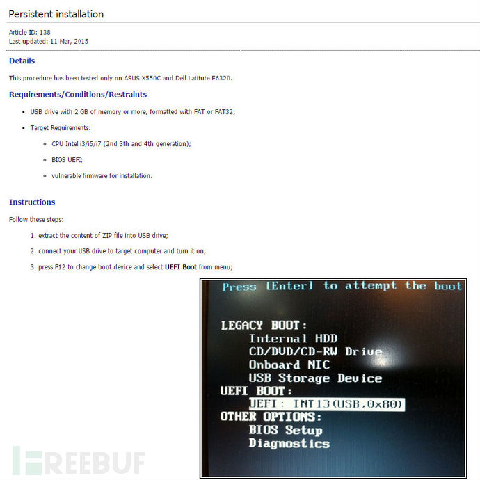 攻击向量(attack vector)指的是黑客用来攻击计算机或者网络服务器的一种手段,攻击向量能够帮助黑客寻找系统可能存在的任何漏洞,包括人为因素,攻击向量简单理解就是网络渗透攻击的各种维度,如通过病毒,电子邮件,网页,聊天室等配合社工欺骗方法来完成。 从泄露代码来看,Hacking Team有自己完善一套攻击向量,有许多维度,如Bios Rootkit攻击,ipa攻击,java applet挂马,假文档图标欺骗,短信欺骗,光盘或U盘存储介质攻击。技术与非技术完美配合,来实现RCS远程控制功能。 以下从Bios Rootkit攻击向量进行分析。 一、攻击场景 想像类似著名电影《碟中谍》的场景。XX黑客组织为了入侵A机构的网络系统,决定派遣一个卧底(wd)进入A机构。突破重重困难,最终wd以一名记者身份得以采访A机构领导,进入了领导的办公室,谈笑间,领导离开一会儿,wd立即警惕起来,盯紧领导的办公桌的电脑,连忙掏出U盘,开机,进入bios,种下Bios Rootkit后门病毒,熟练连贯的操作。三分钟的时间,神不知鬼不觉的,A机构网络系统已经被从内部打开了一个缺口,而且是一个检测极困难的后门…… 场景像拍电影,有点夸张。实际上并不能排除可能性,Bios Rootkit通过物理的接触,如通过U盘,进行感染。 这样的场景可以延伸出来,或发生在电脑维修店、二手电脑、网吧、学校电脑室等。Bios Rootkit是比较高水平的技术,检测很困难。在泄露的源码中,因此更多的人可以从这基础上衍生更多的Bios Rootkit病毒,降低了技术门槛。 二、Bios Rootkit感染方式 HT内部泄露文档介绍,Bios Rootkit是通过U盘,进入UEFI Shell进行感染。要求目标系统cup Intel i3/i5/i7(2,3,4代),bios uefi。
