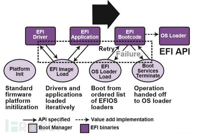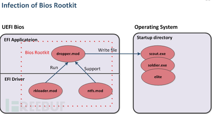 Bios Rootkit的感染方式,决定传播广度有限,但从网络渗透来说,绝对是一个可靠的突破口。目前还没资料证明Bios Rootkit其它感染方式,但并不能排除可能性。 泄露的文档资料: 三、示意图 Bios Rootkit有三个模块:rkloader.mod,dropper.mod和ntfs.mod,攻击示意图如下: 在攻击时,插入U盘,进行UEFI Shell,Startup.nsh引导启动chipsec.efi,然后chipsec.efi把三个.mod模块写到Bios ROM上去,重启电脑时,Bios Rootkit就开始干活了。 四、Bios Rootkit分析 1、UEFI结构 UEFI使用了模块化设计,类似windows操作系统,UEFI Image(UEFI实体)有EFI Driver(驱动),EFI Application(应用程序),os Loader(操作系统引导程序),如下图。