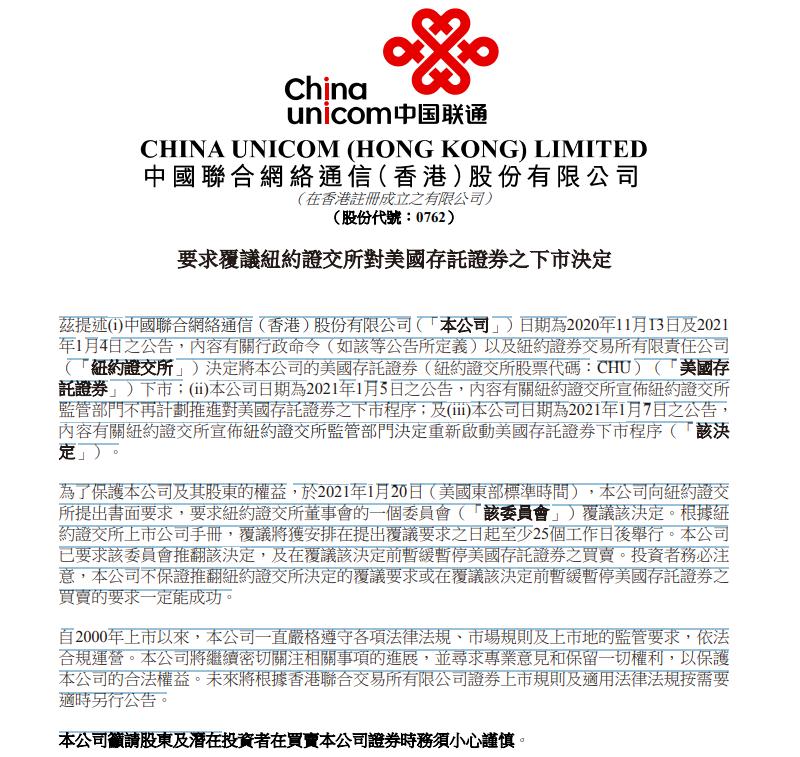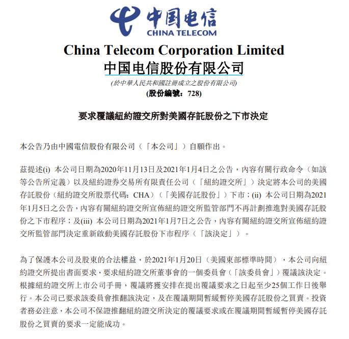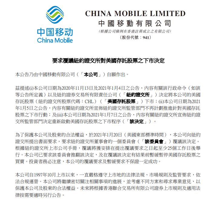 中新经纬客户端1月21日电 21日早间,中国移动、中国联通、中国电信于港交所公告,为了保护公司及其股东的权益,公司1月20日向纽约证交所提出书面要求,要求纽约证交所董事会复议下市决定、对美国存托股票之下市决定。