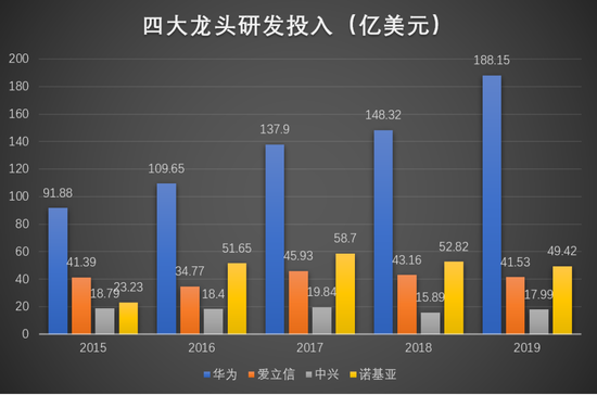 近五年,四家公司每年都投入巨额的研发费用,尤其华为,投入最多且年年正增长,2020年华为年报研发支出更是达到1418.93亿人民币,最低的中兴20年也投入了148亿元,普通公司根本没法承受。