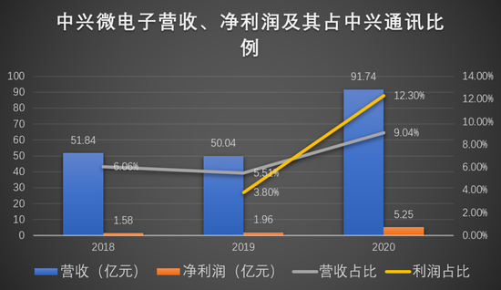 中兴微电子对中兴通讯的业绩贡献愈发明显,2020年更是突飞猛进,实现营业收入91.74亿元,归母净利润5.25亿元,为中兴通讯的9.04%和12.30%,为历史最高值。